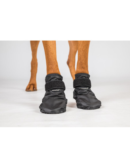 Sockorna fästs med kardborreband runt benet, och kan spännas åt för att sitta på plats ordentligt och inte glida av när hunden rör sig. Alla sömmar är gömda för att förhindra skav. Det gör att de är bekväma både vid rörelse och i vila. Undersidan är försedd med silikongrepp för att hunden inte ska halka.
